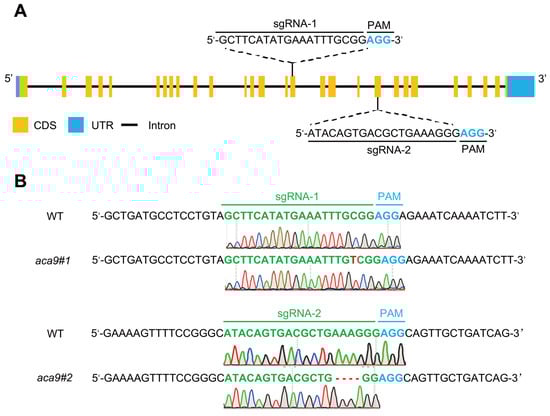 The coding sequence (CDS) of the OsACA9 gene (Os02g0176700) was analyzed by the program CRISPR Design: http://crispr.mit.edu (accessed on 28 June 2022). Two sgRNAs, sgRNA-1 (5′-GCTTCATATGAAATTTGCGG-3′) and sgRNA-2 (5′-ATACAGTGACGCTGAAAGGG-3′), were selected for OsACA9 gene editing and constructed into a CRISPR/Cas9 vector using the BGK03 kit (Biogle, Changzhou, China) according to the manufacturer’s instructions. The vector was transformed into the wild-type rice cultivar ZH11 by the Agrobacterium-mediated method [84]. The genomic DNA from the leaves of transgenic plants was extracted using the CTAB method and used for PCR amplification of OsACA9 gene editing target sites. The primer pairs used for PCR were sgRNA-1 F: 5′-CATGCAGGGGAAGCGTTT-3′ and sgRNA-1 R: 5′-CCTTTTGCCAATCAACCA-3′, and sgRNA-2 F: 5′-GCTCCAGTGAACATAAGATA-3′ and sgRNA-2 R: 5′-CTCGAAAGTATGTACTCCAGAT-3′.