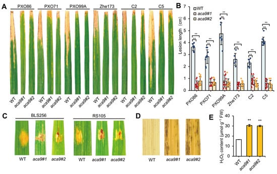 Resistance evaluation of Osaca9 to Xanthomonas oryzae pv. oryzae (Xoo) and Xanthomonas oryzae pv. oryzicola (Xoc) strains and ROS detection in the Osaca9 mutants. (A–C) Defense reactions of wild-type (ZH11) and the Osaca9 mutants to Xoo strains (PXO86, PXO71, POX99A, Zhe173, C2 and C5) (A,B) and Xoc strains (BLS256 and RS105) (C). (D) DAB staining of leaves of wild-type and the Osaca9 mutants. (E) Statistical analysis of H2O2 content. WT refers to the wild-type control, and aca9#1 and aca9#2 refer to two distinct knockout lines of OsACA9. ** indicates the significant difference at p < 0.01 by t-test.