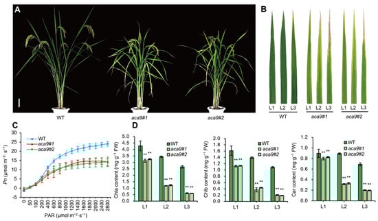 Early-leaf-senescence phenotype of the Osaca9 mutants. (A) Plant phenotype at filling stage (bar = 10 cm). (B) The flag leaf (L1), second top leaf (L2), and third top leaf (L3) at filling stage. (C) Light-response curve of net photosynthesis rate (Pn) of the flag leaves at filling stage. (D) Chlorophyll a (Chla), Chlorophyll b (Chlb), and Carotenoid (Car) content of the leaves shown in (B). WT refers to the wild-type control, and aca9#1 and aca9#2 are two distinct knockout lines of the OsACA9 gene. ** indicates the significant difference at p < 0.01 by t-test.
