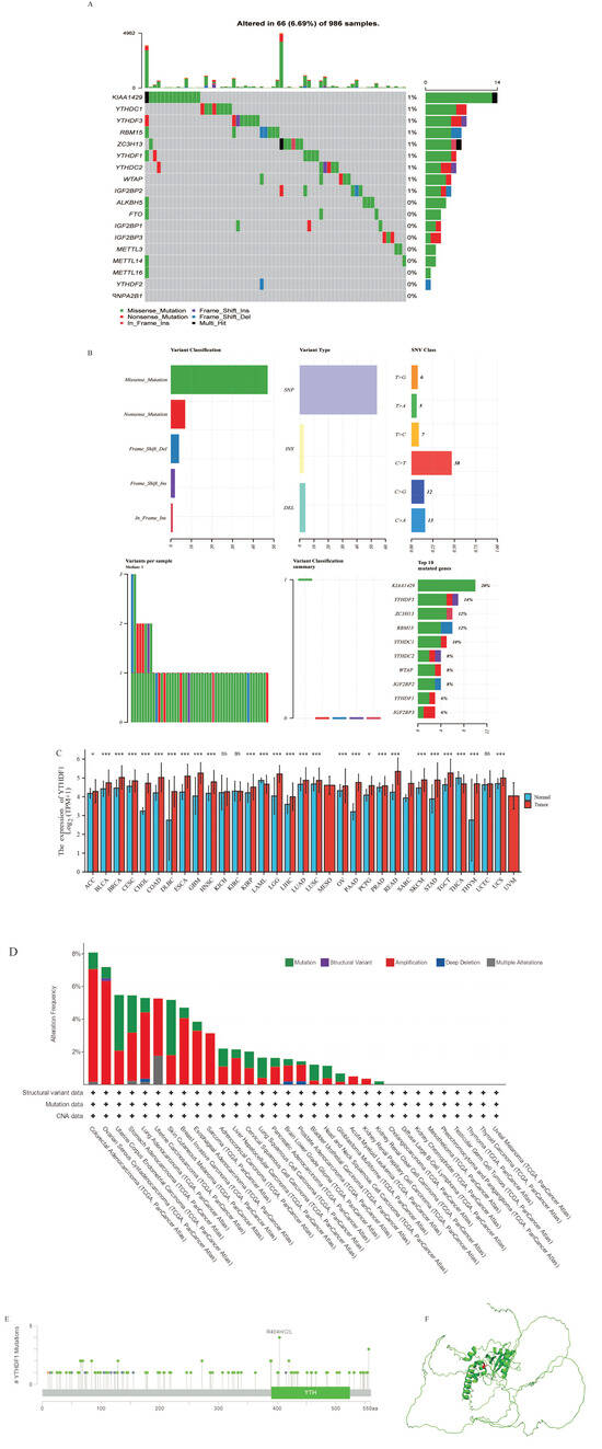 Gene expression profiles of 18 m6A regulators in breast cancer and mutation characteristics of YTHDF1 in different TCGA tumors. (A) Waterfall diagram of gene mutation analysis of 18 m6A regulators in 986 TCGA patients. (B) Summary map of m6A regulatory gene mutations. The 10 most frequently mutated m6A regulators were KIAA1429, ZC3H13, YTHDF3, YTHDC1, HNRNPA2B1, RBM15, YTHDF1, YTHDC2, WTAP, and IGF2BP2. (C) Expression patterns of YTHDF1 in various tumors. ACC: adrenocortical carcinoma; BLCA: bladder urothelial carcinoma; BRCA: breast invasive carcinoma; CESC: cervical squamous cell carcinoma and endocervical adenocarcinoma; CHOL: cholangiocarcinoma; COAD: colon adenocarcinoma; DLBC: lymphoid neoplasm diffuse large B-cell lymphoma; ESCA: esophageal carcinoma; GBM: glioblastoma multiforme; HNSC: head and neck squamous cell carcinoma; KICH: kidney chromophobe; KIRC: kidney renal clear cell carcinoma; KIRP: kidney renal papillary cell carcinoma; LAML: acute myeloid leukemia; LGG: brain lower grade glioma; LIHC: liver hepatocellular carcinoma; LUAD: lung adenocarcinoma; LUSC: lung squamous cell carcinoma; MESO: mesothelioma; OV: ovarian serous cystadenocarcinoma; PAAD: pancreatic adenocarcinoma; PCPG: pheochromocytoma and paraganglioma; PRAD: prostatic adenocarcinoma; READ: rectum adenocarcinoma; SARC: sarcoma; SKCM: skin cutaneous melanoma; STAD: stomach adenocarcinoma; TGCT: testicular germ cell tumors; THCA: thyroid carcinoma; THYM: thymoma; UCEC: uterine corpus endometrial carcinoma; UCS: uterine carcinosarcoma; UVM: uveal melanoma. NS, not significant; * p < 0.05; *** p < 0.001. We analyzed the characteristics of YTHDF1 mutations in TCGA tumors using the cBioPortal tool. The frequency of mutation type (D) and mutation site (E) are shown, (E) yellow dot: splice site, green dot: missense mutation, blue dot: frame shift del. (F) The 3D structure diagram of YTHDF1(marked in green), where the red-labeled sites in the figure are the R404 sites in the YTHDF1 protein structure that are prone to missense mutations.