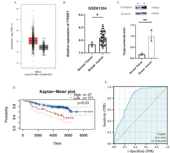 Initially, we used bioinformatics tools (GEPIA, http://gepia.cancer-pku.cn/, accessed on 8 June 2022.) to analyze the expression of YTHDF1 in breast cancer tissues. The results revealed that YTHDF1 was overexpressed in breast cancer patients (Figure 2A). Furthermore, we investigated in detail the transcriptional patterns of 58 breast cancer tissues and 4 non-tumorigenic (NT) breast tissues from the GEO database (GSE61304). The findings showed that, in comparison to normal breast tissues, the m6A reading protein YTHDF1 mRNA was considerably increased in breast cancers (Figure 2B). Using Western blot on previously obtained samples of breast cancer and normal breast tissue, we verified that YTHDF1 was significantly expressed in breast cancer (Figure 2C). In addition, we noticed that its overexpression in breast cancer was associated with a poor prognosis through utilizing the online data platform Kaplan–Meier (http://kmplot.com/analysis/, accessed on 8 June 2022.), which is based on meta-analysis to detect biological indicators of survival for cancer research (Figure 2D). A ROC curve study (Figure 2E) was performed to explore the efficiency of YTHDF1 in distinguishing breast cancer samples (n = 1198) from normal samples (n = 113). The AUC was 0.813 (95% CI: 0.781–0.845). To summarize, the increased expression of YTHDF1, one of the main readers in m6A, may be a significant factor in the advancement and a useful indicator of predicting breast cancer and its prognosis.