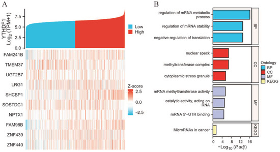 “ClusterProfiler” package was applied to the analysis of GO and KEGG enrichment based on YTHDF1-related DEGs [59]. Adjusted p-values <0.05 were statistically significant.