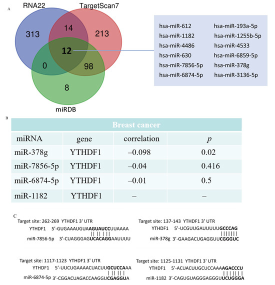 Prediction of YTHDF1 target miRNAs in breast cancer. (A) Venn diagram showing the prediction results of YTHDF1 targets from RNA22, TargetScan7, and miRDB databases. (B) Analysis of the correlation between YTHDF1 and target miRNAs. (C) Prediction of potential binding sites of YTHDF1 to target miRNAs, potential binding sites of YTHDF1 to the corresponding miRNA are shown in bold.