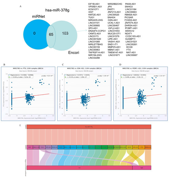 Prediction of lncRNA and ceRNA network construction in breast cancer. (A) Venn diagram showing the target lncRNAs of miR-378g. Correlations between miRNAs and target lncRNAs were analyzed using ENCORI (starBase v2.0) software. Scatter plots were used to show miRNA–lncRNAs with significant correlation. (B) Correlation between miR-378g and FTX. (C) Correlation between miR-378g and GSN-AS1. (D) Correlation between miR-378g and PCBP1-AS1. (E) Sankey diagram showing the lncRNA–miRNA–mRNA (YTHDF1) regulatory network consistent with the ceRNA hypothesis.
