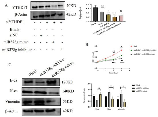 miR-378g inhibits YTHDF1 expression and proliferation of MDA-MB231 cells. (A) Western blot results indicated that YTHDF1 expression was up-regulated in response to down-regulated miR-378g expression. (B) CCK-8 results showed that up-regulation of miR-378g expression delayed the proliferation rate of MDA-MB-231 cells in knockdown of YTHDF1 after 48 h and 72 h. (C) Western blot analysis of EMT expression of miR378g inhibitors and mimics in breast cancer cells. (ns: no significance; * p < 0.05, ** p < 0.01, *** p < 0.001).