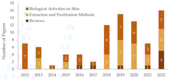 | C. unshiu peel extract | 0.25–1% (w/v) | HDFs cells | MMP-1 expression decreases in a dose-dependent manner; Senescent cells decrease; Collagen biosynthesis increases. | C. unshiu peel extract fermented with S.commune | Cosmetics/ Cosmeceuticals | N/A | [44] |