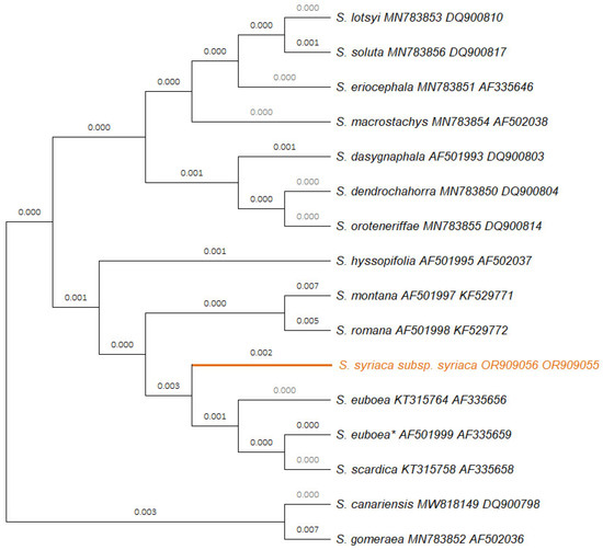Phylogenetic tree illustrating the relationships among 15 Sideritis species based on the molecular plastid markers rbcL and trnL/trnF. The tree was constructed using the neighbor-joining method and maximum composite likelihood substitution model. Accession numbers of DNA sequences obtained in this study are indicated next to taxon names. The clade marked in orange represents the Sideritis syriaca subsp. syriaca GR-1-BBGK-15,5939 studied herein. The taxon marked with an asterisk (*) is characterized as S. syriaca in the database; however, based on its original collection area (Mt. Dirphys in Evia, Greece), it should be identified as the unique local endemic mountain tea plant of this mountain, namely, S. euboea and not as S. syriaca subsp. Syriaca, which is a single-island endemic of Crete Island, Greece [52].