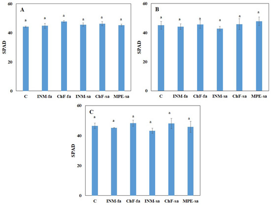 Effect of fertilization schemes applied through foliar or soil on the leaf SPAD value of Sideritis syriaca subsp. syriaca at the vegetative (A), early flowering (B), and full flowering (C) stages. C: Control (water); INM-fa: Integrated nutrient management (INM) by foliar application; ChF-fa: Conventional inorganic fertilization (ChF) by foliar application; INM-sa: INM by soil application; ChF-sa: ChF by soil application; MPE-sa: Mixture of plant extracts as biostimulant by soil application (THEOMASS). Columns represent the means of three replicates ± SEM. Within each plot, different letters indicate significant differences among means.