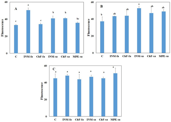 The highest leaf total phenolic content was noted in plants receiving ChF-fa, followed by plants treated with INM-sa or ChF-sa (Figure 6C). Plants treated with INM-sa or ChF-sa had higher total phenolic content as compared to the control; whereas, the ones receiving MPE-sa had the lowest total phenolic content (Figure 6C).
