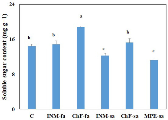 Plants receiving ChF-fa had higher leaf-soluble sugar content than the control; whereas, the ones receiving INM-sa or MPE-sa had lower leaf-soluble sugar contents (Figure 7).