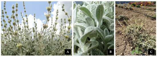 (A) Sideritis syriaca subsp. syriaca wild-growing individual at full flowering on rocky crevices of Sfakianes Madares in Lefka Ori, Chania, Crete (Greece); (B) Densely hairy leaf indumentum; and (C) Pilot field with S. syriaca subsp. syriaca experimental individuals cultivated at the premises of the Hellenic Mediterranean University, Heraklion, Crete (Greece).