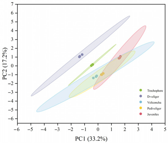 Two-dimensional score plot using the first 2PCs identified by principal component analysis on the entire larval gene set. Fifteen pools of samples were separated into five groups, relevant to the five larval developmental stages. Each stage point included a triplicate.