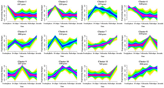 Fuzzy c-means clustering identified twelve distinct temporal patterns of gene expression. The x axis represents six developmental stages, while the y axis represents log2-transformed, normalized intensity ratios in each stage.