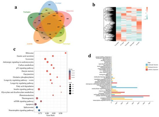 Performing principal component analysis (PCA) conducted on the five larval developmental stages effectively segregated all 15 sample pools into five distinct groups (Figure 1). The first and second principal components collectively explained 50.4% of the variation in the entire dataset, suggesting that veliconcha, pediveliger, and juvenile samples exhibited greater similarities compared to the preceding two stages. It was found that the larvae of the same developmental stages were clustered into one group each, enhancing the reliability and repeatability of this study. To cluster protein expression profiles across all developmental stages, we employed the fuzzy c-means algorithm [19]. This analysis identified 12 distinct clusters of temporal patterns, representing proteins with differing regulation patterns (Figure 2; Supplementary File S1). Notably, clusters 1 and 4 exhibited significant upregulation during the trochophore stages, while clusters 7, 11, and 12 showed significant upregulation during the juvenile stages. Clusters 2, 3, 8, and 9 displayed upregulation with stage-specific patterns across three larval stages, while clusters 5, 6, and 10 exhibited a bi-modal expression pattern. These time course clusters provide insights into the sequence of action for differentially regulated yet co-expressed genes. A total of 21,521 differentially expressed genes (DEGs) were shared in five different stages (Figure 3a) and significantly enriched in five KEGG pathways including apoptosis, thermogenesis, spliceosome, the insulin signaling pathway, and lysosome (Figure 3c). GO analysis, on the other hand, showed that the DEGs enriched cellular anatomical entity, binding, and catalytic activity (Figure 3c).