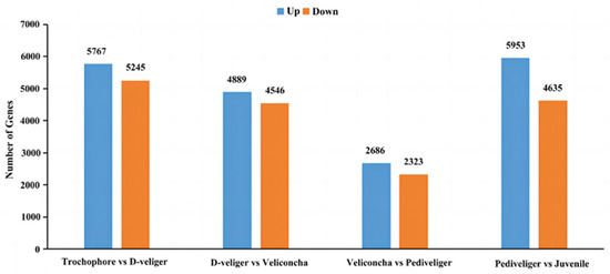 In this study, we used DESeq2 (repeated samples) to analyze the significant gene differences in M. coruscus across consecutive developmental stages. Among the extensive pool of 36,044 unigenes, the most pronounced variation in gene expression was observed between trochophore and D-veliger stage larvae, yielding 11,012 significant genes. Conversely, the fewest genes exhibited alterations between the veliconcha and pediveliger stages, amounting to 5009 significant genes. The majority of genes displayed significant alterations in expression profiles during larval development (Figure 4).