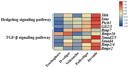 The development of and growth in larvae processes were closely related to the regulation of gene expression and the transcriptome. Understanding the growth and development of larvae can help optimize M. coruscus culture techniques and help improve their growth rate and survival rate. Studies have demonstrated the fundamental roles of the Hedgehog signaling pathway and transforming growth factor-β in normal embryonic development, emphasizing their pivotal involvement in intercellular signaling, as well as the maintenance, renewal, and regeneration of adult tissues [20,21]. Shh (sonic hedgehog homology) binding to Ptc (patched) activates Smo (smoothened), causing dissociation of SuFu from Gli and forming GliA, promoting the expression of target genes. Evidence from several studies suggested that Shh controlled early vertebrate midline organization, control of embryonic left and right, and the establishment of the dorsoventral axis [22,23]. The results of this study showed that the expression of Shh was basically absent in the period of trochophore and veliconcha stages, and less in the period of D-veliger and pediveliger stages. The embryonic shell begins to form in the D-veliger stage and the shell morphology and structure of the larva change during the transition from the D-veliger to veliconcha stages [24]. The study reported that the expression of the Smo gene promoted the proliferation of mouse chondrocytes [25], whereas mutations in Smo caused phenotypic defects in zebrafish body size and cartilage [26]. Cynthia proposed that mice without specific gene Ptc influenced the Shh/Ptc pathway on both normal and abnormal cell proliferation [27], indicating the functional consequences of its inactivation on the control of proliferation. Based on this study, Smo was expressed at a lower level in the first four periods, while Ptch1 and Gli2/3 showed a gradual increase in expression as downstream transcription factors of the pathway. We suggested that these might be involved in changes in the morphological structure of shells. All genes involved in the Hedgehog signaling pathway exhibited significant upregulation during the juvenile stage. In Mollusca, studies have explored the involvement of the Hedgehog signaling pathway in myogenesis, as observed in Sepia officinalis [28] and Crassostea gigas [29]. Specifically, Hedgehog signaling played a critical role in the precise patterning of obliquely striated muscle fibers in the cuttlefish mantle. In the juvenile stage, secondary shell formation occurs in M. coruscus larvae. The juveniles secrete byssal threads for attachment and sustenance, with well-developed gills enabling respiration and filter feeding. It was speculated that the genes in the Hedgehog signaling pathway may be involved in the attachment metamorphosis development of larvae, which promotes the formation of secondary shells in larvae through cell proliferation and may be involved in the physiology of larvae and the development of some organs.