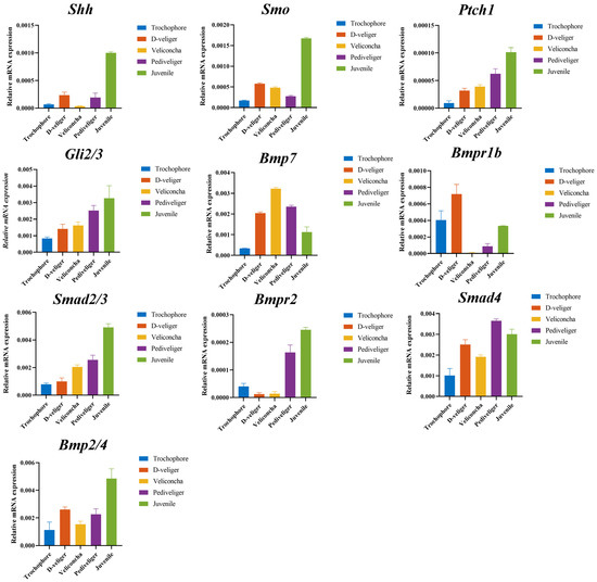 The transforming growth factor-β (TGF-β) superfamily represents a fundamental and ancient mode of intercellular signaling in eukaryotic animals [30]. TGF-β signaling is pivotal in various developmental and homeostatic processes, including the establishment of the embryonic body plan and subsequent determination and maintenance of cell identities [31]. Within this superfamily, members like TGF-betas, activins, and BMPs (bone morphogenetic proteins) are structurally related secreted cytokines, found across a wide range of species from worms and insects to mammals [32,33]. The biological effects of BMPs are conveyed through intracellular pathways such as BMP–Smad and BMP–MAPK. Loss-of-function studies on TGF-β family ligands in mice emphasize their crucial roles in embryonic development and maintaining tissue balance into adulthood [34]. Notably, in pearl oysters and other bivalves, while the typical TGF-beta molecule is absent, essential components of this signaling pathway, including the primary growth factor BMPs, are still present [35]. Smads, acting as intracellular nuclear effectors of the TGF-β family, play a crucial role. The intracellular signaling triggered by Bmps initiates as the ligands bind to their transmembrane serine/threonine kinase receptors, leading to the phosphorylation of members of the Smad family. The Smad2 gene is a downstream signaling molecule of the TGF-β superfamily; we analyzed the expression profiles and found that Smad2/3 was upregulated continuously, which played the role of propagating signals in the whole larval developmental period. Smd4 is involved in regulating various physiological processes such as tumor metastasis, chondrocyte and bone development, and oocyte growth through the TGF-β pathway [36,37,38]. Its high expression in the five stages of our study implied potential roles in M. coruscus development. The BMP protein family, which includes BMP2, BMP4, and BMP7, among others, constitutes bone morphogenetic proteins known as osteoinductive factors that induce osteoblast differentiation. Bmp7, Bmpr1b, and Bmp2/4 upregulated from the trochophore to the D-veliger stage. At this stage, the primary shell of mussel larvae is starting to develop, and some organ primordia, like the primordia for the closing shell muscles, have begun to take shape [24]. In addition, Bmp7 expression peaked during the veliconcha stage, while Bmp2/4 exhibited the highest expression levels during the juvenile stage. The M. coruscus undergoes a morphological transformation from the D-veliger stage to the veliconcha stage. A notable aspect of this metamorphic process is the detachment of the larval velum, accompanied by the development of gills and the formation of the secondary shell [39].