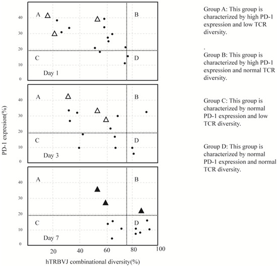 TCR diversity plotted versus PD-1 expression on quadrant charts for days 1, 3, and 7. (The data are from the experiment conducted by Atsutoshi Tomino et al. [56]). In each of the quadrant charts for days 1, 3, and 7, there are four zones defined by the normal thresholds of TCR diversity and PD-1 expression. These thresholds are determined based on the lower quantile data from healthy volunteers for TCR diversity (78.3%) and the upper quantile data for PD-1 expression (19.5%). The patients with CMV reactivation who unfortunately passed away are indicated by closed triangles on day 7 and by open triangles on days 1 and 3. The individual values of TCR diversity and PD-1 expression for each patient are presented in the charts.