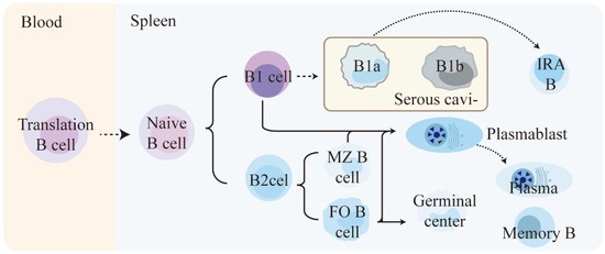 Differentiation process of mouse B cell subpopulations under physiological conditions. (The content shown in the figure is referenced from the article by Sandra Romero-Ramírez [63]). This passage describes the maturation and differentiation of B cells in the spleen. Naive B cells first mature from immature/transitional stages in the spleen and give rise to two lineages, B1 cells and B2 cells. B1 cells differentiate into B1a and B1b cells, while B2 cells in the spleen form FO B and MZ B cells. FO B cells are found in the follicles of lymphoid organs and MZ B cells reside in the splenic marginal zone. When mature B cells encounter antigens, they may differentiate into short-lived plasmablasts or enter the germinal center reaction. Eventually, they differentiate into long-lived plasma cells or memory B cells. Additionally, serosal B1a cells can migrate to the spleen and become IRA B cells, which are characterized by GM-CSF secretion.