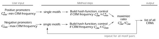 The presented method aimed to target the following several challenges: detect novel motif combinations; minimize the number of input parameters from the user by estimating them using input DNA sequences; perform an exhaustive search to find the most significant CRMs; and finally, be computationally effective. The exhaustive search (also called brute force search) is the examination of all combinations of motif types, thresholds, and distances between motifs. The computational efficacy is achieved using the special hash function to organize the space of potential modules, followed by a reduction in search space using limitations on the module’s presence in datasets. Schematically, the method is represented in Figure 1.
