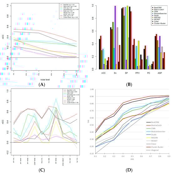 Comparative testing of BestCRM on the dataset from []. (A). Performance over different noise levels. nCC (nucleotide correlation coefficient) shows how many nucleotides within CRM on average were predicted correctly. (B). Different parameters reflect the quality of predictions: Sn—sensitivity; SP—specificity; PPV—positive predictive value; PC—performance coefficient; ASP—average site performance. (C). nCC values over different classes of transcription factors. (D). Receiver operating characteristic (ROC) and area under curve (AUC) of recognition methods. (A–C) produced by evaluation software [].
