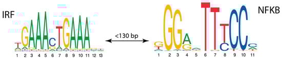 The CRM found in the breast dataset consists of motifs for interferon-regulatory factors (IRFs) and nuclear factor-κB (NFKB), found by respective PWMs with the thresholds 0.92 and 0.68, respectively, and located at a maximum distance of 130 bp (Figure 3). The family of IRF plays an important role in defense against intracellular pathogens, including the expression of intrinsic anti-microbial defense and the production of interleukin-12 (IL12), which are essential for the priming of early T cell-mediated immune responses []. Second, TF-NFκB consists of a family of transcription factors that play a critical role in inflammation, immunity, cell proliferation, and survival []. So, based on our statistical analysis of motif combinations in promoters active in breast tissue, a novel potential CRM was found with functionally relevant transcription factors.
