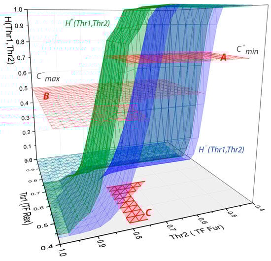 Hash functions for transcription factors REX and FUR. Green surface (H+) is a hash function built for positive promoters (B.subtilis promoters), and a blue surface (H−) is for the negative (random genomic sequences). A—area of parameters (Thr1, Thr2), where more than of positive promoters contain CRM; B—area of parameters (Thr1, Thr2), where less than of negative promoters contain CRM; C—intersection of A and B area, where the ratio should be maximized. Parameter D—distance between motifs is not presented here to be able to draw the surfaces in three-dimensional space.