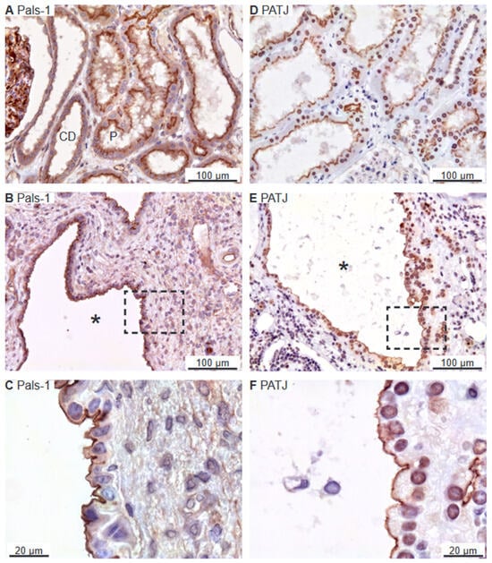 The Crumbs and Par complexes constitute the defining apical membrane domain protein complexes [,]. Figure 2D illustrates apical membrane immunoreactivity for Crumbs-3 in proximal and distal renal tubules. Apical Crumbs-3 staining was observed in all immunoreactive cysts (Figure 2E,F). Apical immunostaining of the other Crumbs complex proteins Pals-1 (majority of cysts) and PATJ was also observed in renal tubules as well as in all immunoreactive cysts (Figure 3A–C and Figure 3D–F, respectively).