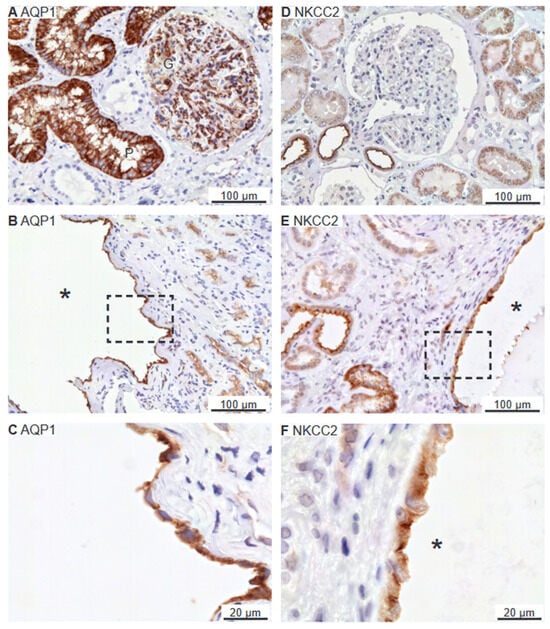 Renal cysts can arise from virtually all parts of the renal tubular system [,]. To assess the origin of cysts in the 6 biopsies, antibodies were applied to identify cysts with the proximal tubule marker: the water channel aquaporin-1 (AQP1),as only renal cortex is present, the thick ascending limb (TAL) marker: sodium-potassium-chloride exchanger 2 (NKCC2), the distal tubule markers: the sodium–chloride cotransporter (NCC), and parvalbumin, as well as the collecting duct marker: the water channel aquaporin-2 (AQP2). As illustrated in Figure 6A, AQP1 is expressed in proximal tubules with staining mainly in the basolateral domain. Robust labelling was also observed in capillary endothelia. Cysts were rarely identified with AQP1 immunoreactivity, but positive cysts displayed both apical and basolateral membrane labelling (Figure 6B,C). NKCC2 immunoreactivity was observed in the apical membrane domain of cortical tubules (Figure 6D) as well as in NKCC2-immunoreactive cysts (Figure 6E,F). Tubular NCC immunoreactivity was found exclusively at the apical domain of immunoreactive distal renal tubules (not shown). NCC immunoreactivity was observed in rare cysts apparently with staining of the underlying basement membrane and was therefore considered unspecific staining (not shown). Parvalbumin was also expressed in distal renal tubules in the expected cytosolic pattern (Figure 7A). Rare parvalbumin-positive cysts also displayed cytosolic staining (Figure 7B,C). AQP2 immunoreactivity was observed in collecting ducts with the main reaction corresponding to the apical membrane domain (Figure 7D). Renal cysts also displayed apical membrane domain labelling for AQP2 (Figure 7E,F). Thus, except for flat cyst epithelia, renal cysts expressed markers for at least one of the markers of proximal tubules, thick ascending limbs, distal convoluted tubules, or collecting ducts. Double fluorescence immunolabelling did not reveal cysts that were positive for more than one tubule marker (not shown).
