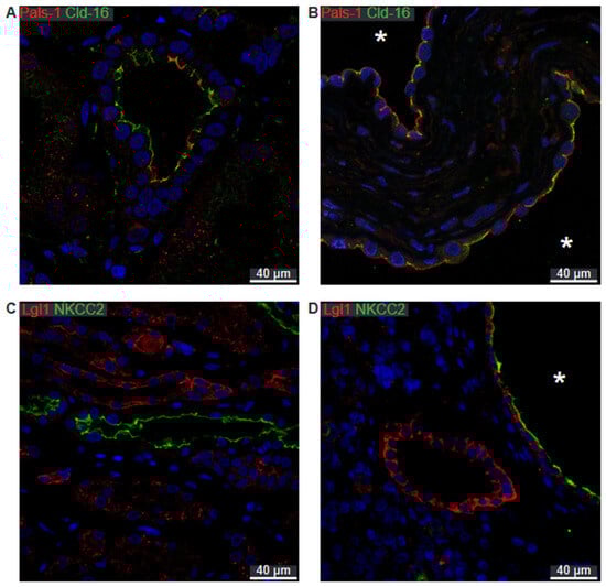 Due to difficulties in obtaining satisfactory double-labelling, we employed another marker for the thick ascending limb, Claudin-16. In normal human thick ascending limb, the Crumbs complex component Pals-1 is apically immunolocalized (Figure 9A). The same localization is apparent in the Claudin-16-positive cysts (Figure 9B). Lgl-1 localizes to the basolateral domain in both normal human tubules and in the TAL-derived cysts (Figure 9C,D). We note that there is no signal for Lgl-1 in the normal TAL (Figure 9C), while a clear basolateral signal is evident in the NKCC2-positive cyst (Figure 9D).