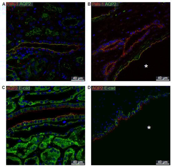 Double immunofluorescence for collecting duct AQP2 and cell polarity proteins. (A) Labelling for Pals-1 (red) and AQP2 (green) in normal human kidney with tubular and cellular colocalization. (B) Labelling for Pals-1 (red) and AQP2 (green) in hPKD kidney showing a cyst (asterisk) with similar cellular colocalization. (C) Labelling for AQP2 (red) and E-cadherin (green) in normal human kidney with tubular and cellular colocalization. (D) Labelling for APQ2 (red) and E-cadherin (green) in hPKD kidney showing a cyst (asterisk) with similar cellular colocalization. Nuclei are marked in blue.