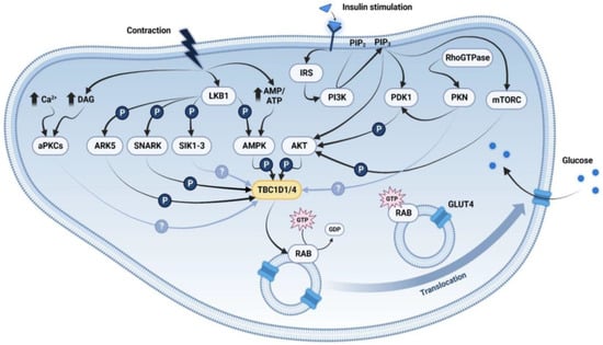 Maintaining stable blood glucose levels is important to ensure physiological body function and sufficient energy supply to meet changes in energy needs. Therefore, hormonal and metabolic signals regulate the mechanisms that raise and lower blood glucose. One regulatory mechanism is the secretion of insulin by the islets of Langerhans, which is stimulated by a postprandial rise in blood glucose levels and induces elevated blood glucose uptake in peripheral tissues (reviewed in [1]). Skeletal muscle is responsible for the vast majority of insulin-stimulated glucose disposal, but it is also unique in that it exhibits increased glucose uptake in response to exercise and muscle contraction [2,3]. Insulin resistance (IR), a condition in which peripheral tissues lose their ability to absorb glucose from the bloodstream in response to insulin stimulation, plays a crucial role in the development and progression of metabolic diseases such as type 2 diabetes. IR can occur undetected in pre-diabetics years before the disease develops [4,5,6]. Chronic hyperglycemia caused by insulin resistance leads to serious complications such as retinopathy, cancer, cardiovascular disease, neuropathy and nephropathy (reviewed in [7,8,9,10,11,12,13,14]). Interestingly, exercise-stimulated glucose uptake in skeletal muscle is not impaired in insulin-resistant subjects [15] (reviewed in [16]). Exercise is therefore an excellent therapeutic option for both diabetic and prediabetic individuals [17]. The intracellular pathways by which insulin stimulation and exercise induce glucose uptake in skeletal muscle are distinct but appear to converge at TBC1D1 and TBC1D4 (also known as AS160, AKT substrate of 160 kDa), two key signaling molecules critical for the regulated trafficking of the facilitative glucose transporter type 4 (GLUT4) [18,19,20]. Phosphorylation of the two Rab GTPase-activating proteins (RabGAPs) by insulin- and contraction-sensitive kinases leads to increased translocation of GLUT4 to the plasma membrane and consequently to increased uptake of glucose into the cell (reviewed in [21]). To date, at least a dozen phosphorylation sites have been identified in TBC1D1 and TBC1D4, most of which have been described as targets for the serine/threonine kinases AKT and the AMP-dependent kinase AMPK (reviewed in [22]). The regulatory mechanisms underlying the phosphorylation of RabGAPs that mediate exercise and insulin signaling are largely unknown. Only a few serine and threonine sites in TBC1D1 and TBC1D4 have a specific upstream kinase described.
