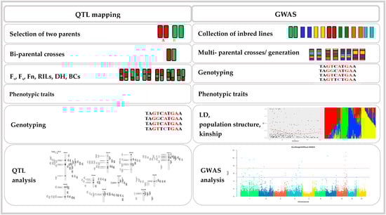 GWAS serve the purpose of identifying associations between genotypes and target traits. It has emerged as a powerful alternative to conventional QTL mapping for pinpointing the genetic loci underlying traits with a high resolution [44,45]. The Basic GWAS Approach is shown in Figure 2; when genotypes and phenotypes are obtained, GWAS analysis can be performed, in addition, to improve the mapping power, and several statistical methods in GWAS have been employed with the corresponding software Tassel version 5.0.