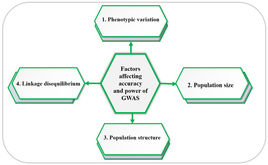 GWAS possess a remarkable ability to uncover precise associations between genetic markers and phenotypic traits. However, the effectiveness of GWAS is influenced by various factors, particularly when it is applied to specific target traits. A key determinant in this regard is the extent of phenotypic trait variance within the natural population. The power of GWAS is closely linked to its resolution, as a higher resolution enhances the accuracy of identifying candidate genes associated with a particular trait. Notably, it also aids in the discovery of novel genes associated with the trait of interest [65]. In the realm of maize genetics, GWAS has played a pivotal role in identifying thousands of candidate genes linked to important traits. However, the challenge lies in understanding how much phenotypic variance can be attributed to the variations in two alleles, and this often hinges on the magnitude of their influence and their frequency differences within the sample. It is worth noting that GWAS face impediments in the form of rare variants and small effect sizes when attempting to elucidate these associations [37]. In Figure 3, we delve into four crucial factors that significantly impact the accuracy and power of GWAS, as detailed below [14]: