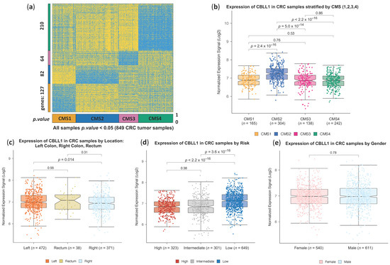 CBLL1 gene expression increases in CMS2 subtype tumour samples of CRC patients. (a) Heatmap showing the expression profile of 483 genes in 849 CRC tumour samples classified as significant in one of the 4 consensus molecular subtypes (CMS 1,2,3,4) of colorectal cancer. The classification was performed on an initial cohort 1273 CRC primary tumour samples using the gene signature published by [3], which includes 127 genes for CMS1, 82 genes for CMS2, 64 genes for CMS3, and 210 genes for CMS4; (b) boxplots presenting the expression profile of gene CBLL1 (HAKAI) in the four CMSs of 849 CRC tumour samples. The samples are separated into consensus molecular subtypes: CMS1 165 samples, CMS2 304 samples, CMS3 138 samples, and CMS4 242 samples; (c) expression of CBLL1 in CRC tumour samples separated by location (for the samples of the 1273 CRC cohort where the location was known): left side of the colon (472 samples), right side of the colon (371 samples), rectum (38 samples); (d) expression of CBLL1 in the 1273 CRC cohort separated by risk (low-risk, intermediate and high-risk) following the tumour risk analysis provided in [30]; (e) expression of CBLL1 in CRC tumour samples separated by gender: 540 females and 611 males.