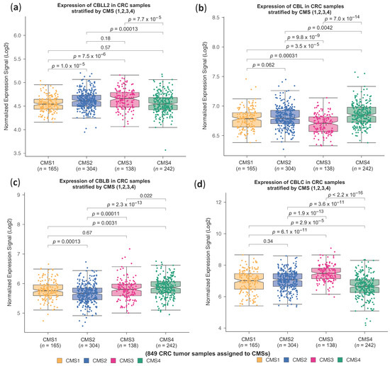 We then investigated whether we could find a similar specific association between high expression of the CBLL1 gene and CMS2 in the other reported mammalian homologues of the CBL family, including CBLL2, CBL, CBLB and CBLC. As shown in Figure 2, the high expression of the rest of the protein members belonging to the CBL family was not specifically associated with CMS2. For example, the expression CBLL2, the closest family member to CBLL1 sharing a similar molecular structure, is not specifically associated with any of the four consensus molecular CRC subtypes (Figure 2a). On the contrary, high CBL expression is specifically associated with CMS4 compared to the rest of the CMSs, whereas the low expression of CBL was associated with CMS3 (Figure 2b). Interestingly, low CBLB expression was specifically associated with CMS2 (Figure 2c). Finally, the highest expression of CBLC was associated with CMS3, while low expression was associated with CMS4 (Figure 2d). Taken together, these results indicate that a high expression of CBLL1 and low expression of CBLB are associated with CMS2; a high expression of CBLC and low expression of CBL are associated with CMS3; and a high expression of CBL is associated with CMS4. In conclusion, we propose CBLL1 as a new biomarker gene for the stratification of CMS2 colorectal cancer patients.