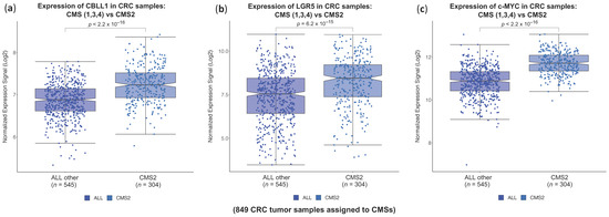 Expression of CBLL1, LGR5 and c-MYC in a cohort of 843 CRC primary tumour samples. The samples are separated in two groups of CM subtypes: CMS2 (n = 304 samples) versus the rest of CMSs (CMS1, CMS3, and CMS4, n = 545 samples). (a) Boxplots presenting the expression of CBLL1 in these two groups; (b) boxplots presenting the expression of LGR5 in the two groups; and (c) boxplots presenting the expression of c-MYC in the two groups.