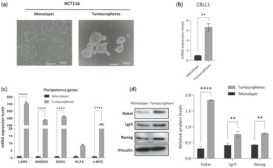 To understand the potential molecular mechanism by which CBLL1 might be involved in cancer stem cells, HCT116 colon cell lines were grown in 2D as a monolayer cell culture (Figure 4a, left panel) and as a 3D cancer stem cell tumoursphere-derived HCT116 (Figure 4a, right panel) by culturing in ultra-low attachment plates grown in a specific medium to enrich cancer stem cell growth. As shown in Figure 4b, CBLL1 mRNA levels are highly upregulated in cancer stem cell tumoursphere-derived HCT116 compared to HCT116 monolayer cell culture. Furthermore, the high CBLL1 expression observed in the tumourspheres was accompanied by the upregulation of other established cancer stem cell markers, including LGR5, NANOG, SOX2, KLF4 and c-MYC mRNA levels (Figure 4c). This increase in cancer stem cell biomarkers was confirmed at the protein level, as observed in cancer stem cell tumourspheres for Hakai (CBLL1), Lgr5 and Nanog compared to protein expression in monolayer cultures (Figure 4d). Taken together, these results suggest a possible role for CBLL1 in the formation and/or maintenance of cancer stem cell tumourspheres.