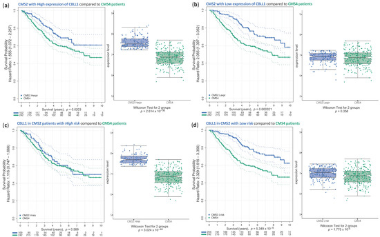 Survival analysis of colorectal CMS2 patients separated using high and low expression (H.expr or L.expr) of the CBLL1 gene (a,b), as well as separated in patients of high and low risk (H.risk or Low.risk) (c,d), compared with CMS4 patients. (a) Boxplots presenting the comparison of CMS2 patients with high CBLL1 expression (n = 152) and CMS4 patients (n = 242); and the corresponding Kaplan–Meier curve presenting the survival analysis in these two groups of samples; (b) boxplots presenting the comparison of CMS2 patients with low CBLL1 expression (n = 152) and CMS4 patients (n = 242); and the corresponding Kaplan–Meier curve presenting the survival analysis in these two groups of samples; (c) boxplots presenting the comparison of the expression of CBLL1 in CMS2 patients that have high risk (i.e., poor survival) (n = 100) and CMS4 patients (n = 242); and the corresponding Kaplan–Meier curve presenting the survival analysis in these two groups of samples; (d) boxplots presenting the comparison of the expression of CBLL1 in CMS2 patients that have low risk (n = 204) and CMS4 patients (n = 242); and the corresponding Kaplan–Meier curve presenting the survival analysis in these two groups of samples.
