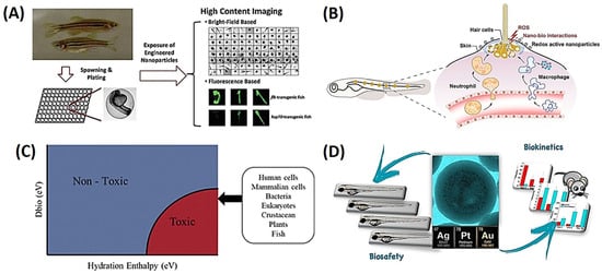 The article utilizes zebrafish models to assess the safety of engineered nanomaterials (ENMs). To compare the harmful effects of several transition metal oxide NPs (copper oxide (CuO), zinc oxide (ZnO), nickel oxide (NiO), and cobalt oxide (Co3O4)) on zebrafish embryos and larvae, the researchers used high-content bright-field and fluorescence-based imaging []. They discovered that some NPs interfered with hatching in a dose-dependent manner. This was probably caused by the loss of Cu and Ni ions, which compromised zebrafish hatching enzyme 1 (ZHE1). However, there were no apparent morphological anomalies. Additionally, certain NPs caused transgenic zebrafish larvae to express more heat shock protein 70 (HSP70), which can be used for hazard ranking and dose–response analyses. In general, HSP70 expression and high-content imaging of embryo development can be a useful technique for determining the safety of ENMs in zebrafish, as shown in Figure 1A []. An article covers the potential for harm to biological systems from redox-active metal oxide NPs and includes studies utilizing zebrafish as a model organism to examine the biological injury potential and processes of two metal oxide libraries, Co3O4 and palladium oxide (PdO)-Co3O4. The research discovered that Cu dopants increased Co3O4′s ability to oxidize, increased the mortality of dechorionated embryos, and increased the severity of skin damage in exposed larvae. Additionally, more PdO led to larger heterojunction densities, which raised the oxidizing capability. The NPs caused epidermal damage and triggered immune cell infiltration, which led to an inflammatory reaction. The skin injury reduced the tolerance level against other environmental pollutants, even if exposure to the NPs alone was not fatal. However, the skin damage in larvae was temporary and reversible because they were able to recover in uncontaminated media in just 24 h, as shown in Figure 1B []. Gakis et al. discussed increasing concerns over the impacts of engineered NPs on humans, animals, and ecosystems and the development of in silico methods such as structure–activity relationship (SAR) models to rapidly screen for toxicity. The authors redirected their attention to extracting valuable mechanistic insights from models by employing a substantial dataset comprising 935 toxicity measurements of 45 metal and metal oxide nanoparticles (NPs). They constructed classification nanostructure–activity relationship (nano-SAR) models, which effectively categorized NPs according to their toxicity to different cells and organisms, thereby identifying potential mechanisms of toxicity. The proposed approach sought to steer researchers towards the development of nanoparticles designed for safety and foster more informed risk assessments of nanoparticles, as illustrated in Figure 1C [].