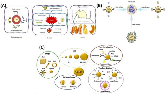 (A) Schematic representation of in vitro and in vivo toxicity of gold nanoparticles (AuNPs). Reproduced with permission from ref. [], Elsevier 2017. (B) Application of delivery carriers for AuNPs. Reproduced with permission from ref. [], Frontiers Media S.A. 2020. (C) Different factors influencing AuNPs’ toxicity include their shape, size, functionalization, surface charge, and surface coatings. Reproduced with permission from ref. [], MDPI 2021.
