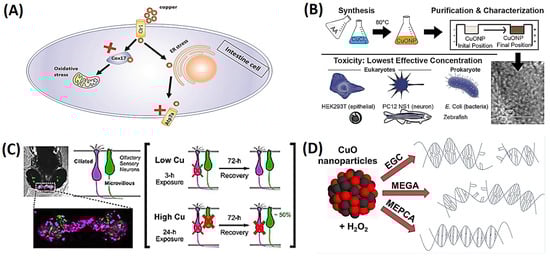 Zhao et al. investigated the impact of CuNPs and the released Cu2+ on intestinal development in zebrafish embryos. The results revealed that exposure to elevated levels of CuNPs or Cu2+ led to damage in intestinal development in a dose-dependent manner. CuNP exposure resulted in a reduction in the expression of intestinal marker genes while increasing the expression of endoplasmic reticular (ER) stress marker genes in zebrafish intestines. Immunofluorescence analysis indicated that both CuNPs and Cu2+ induced the production of ER stress and oxidative stress in intestinal cells. The inhibition of ER stress or oxidative stress using 4-phenylbutyric acid or ROS scavengers restored the expression of intestinal marker genes. Interestingly, blocking the transport of copper to mitochondria or the trans-Golgi network did not alleviate copper-induced intestinal developmental defects. In summary, this study demonstrated that CuNPs and Cu2+ induce intestinal developmental defects by triggering ER and ROS stress, as depicted in Figure 4A [,].