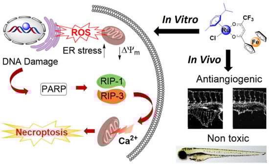 One recent study showed that resistance and adverse effects of platinum anticancer medications were addressed by combining the pharmacophores of ruthenium and ferrocene to create a bimetallic anticancer agent []. The agent’s cellular absorption, intracellular distribution, and effects on nucleophilic biomolecules were assessed, along with its in vivo antiangiogenic capabilities, Pt cross-resistance profile, and anticancer efficacy. According to research, the substance caused mitochondrial malfunction, ER stress, and necroptotic cell death mediated by poly(ADP-ribose) polymerase by producing ROS. In order to comprehend the effects of various groups on the anticancer potency of the Ru-Fc hybrid, the mechanism of action is shown in Figure 7 [].
