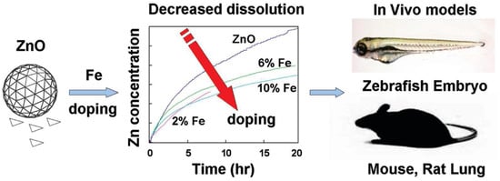 A recent study demonstrated the usage of iron (Fe)-doped ZnO NPs to lessen the harmful effects of ZnO NPs in vivo []. In cellular screens, it was discovered that the doped particles had lower rates of dissolution and toxicity. The doped particles reduced harmful effects such as inflammatory cell infiltrates, cytokine levels, and lactate dehydrogenase (LDH) release in rodent and zebrafish models. According to the study, iron doping could be a secure design technique to avoid ZnO toxicity in both animals and the environment, as shown in Figure 8 [].