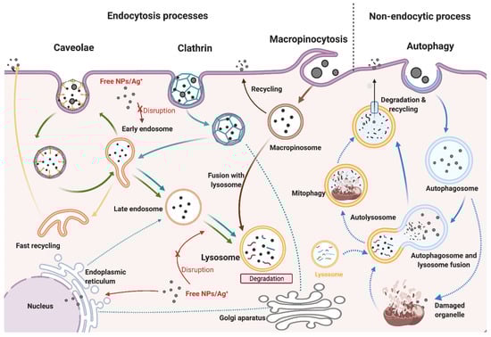 Cellular uptake is a fundamental biological process employed by cells, necessitating various transport mechanisms to facilitate the ingestion of macroparticles from their surroundings. This process is collectively referred to as receptor-mediated endocytosis, encompassing phagocytosis and pinocytosis. Phagocytosis entails cells engulfing particulate matter for subsequent digestion, while pinocytosis relies on vesicles to internalize fluids and other molecules, depending on the specific molecular interactions triggered. Both caveolin-dependent endocytosis and clathrin-dependent endocytosis lead to the formation of early endosomes, which are endocytic vesicles. Caveolin-dependent endocytosis, in particular, involves the internalization of external materials within flask-shaped vesicles through receptor binding on cell membranes and their corresponding external targets. Conversely, micropinocytosis involves the creation of large vesicles capable of internalizing nonspecific cargoes and substantial quantities of fluid. Consequently, the extent of cellular uptake can vary depending on the particle size of the nanoparticle, as illustrated in Figure 9 [].
