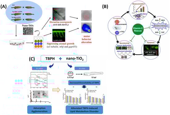 (A) Exposure to nano-TiO2 results in DNA damage and adverse neural outcomes in zebrafish larvae, inhibiting neurodevelopment and motor neuron axonal growth. Reproduced with permission from ref. [], Elsevier 2021. (B) Exposure to high levels of nano-TiO2 inhibits neurodevelopment and motor neuron axonal growth in zebrafish larvae, leading to adverse neural outcomes and altered gene expression. Reproduced with permission from ref. [], Elsevier 2023. (C) Co-exposure of TBPH and nano-TiO2 reduces toxicity in zebrafish embryos due to larger agglomerates. Reproduced with permission from ref. [] Elsevier 2022.