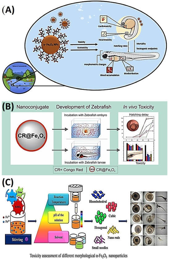(A) Developmental toxicity of iron oxide nanoparticles (IONPs) and dissolved iron in zebrafish embryos. IONPs accumulated on the chorion and caused sublethal cardiotoxic effects. Semi-static exposure induced higher embryotoxicity than static exposure. Reproduced with permission from ref. [], Elsevier 2020. (B) Evaluating the developmental toxicity of CR@Fe3O4 NPs toward zebrafish. Reproduced with permission from ref. [], Elsevier 2020. (C) Schematic illustration of toxicological assessment of different IONPs using a zebrafish model. Reproduced with permission from ref. [], Elsevier 2019.