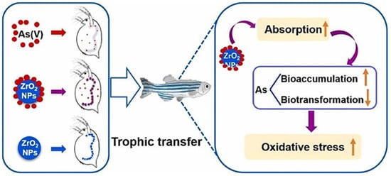 Recent work delved into the influence of zirconium dioxide (ZrO2) NPs on the accumulation, trophic transfer, transformation, and detoxification processes of arsenate (As(V)) within the aquatic food chain, with a specific focus on Daphnia magna (water flea) and Danio rerio (zebrafish) []. The findings revealed that ZrO2 NPs heightened the absorption of both total arsenic and As(V) in the tissues of both water fleas and zebrafish. Additionally, these nanoparticles facilitated the conversion of inorganic arsenic (iAs) into monomethylated acid (MMA) while diminishing the production of arsenobetaine (AsB), consequently elevating iAs levels. Moreover, co-exposure to As(V) and ZrO2 NPs upregulated genes associated with absorption (e.g., aqp7), biotransformation (e.g., gst and gss), and detoxification as well as oxidative stress (e.g., mt2, cat, sod1, and sod2). These genetic responses led to heightened detrimental effects on both water fleas and zebrafish, exacerbating the ecological risks associated with As(V) within the aquatic food chain. This study underscores the imperative to consider the cumulative toxicity of As(V) and ZrO2 NPs in aquatic environments, as depicted in Figure 15 [].
