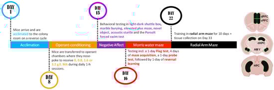 Summary of the procedural timeline employed in the dose–response study of high-concentration MA (0.8, 1.6, 3.2 g/L), during which mice were trained to nose poke for the delivery of 20 µL of their assigned MA reinforcer over the course of 7 days. The day following the end of self-administration, mice underwent a 1-day behavioral test battery to assay sensorimotor gating and negative affect. Mice were then tested under our Morris water maze and radial-arm maze procedures. Then, tissues were dissected from the ventral and dorsal aspects of the prefrontal cortex (PFC) and the hippocampus (HPC) (which were combined into one sample), as well as from the amygdala (AMY), and they were processed by immunoblotting for the protein expression of glutamate-related proteins and their downstream effectors, ERK and CaMKIIα.