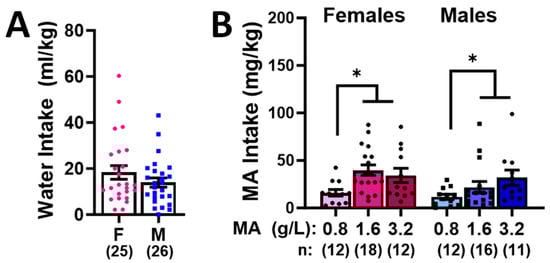 Examination of sex differences in the average total intakes of water (A) and different MA concentrations (B) during daily 1 h operant-conditioning sessions over the 7-day course of self-administration. The data represent the means ± SEMs of the numbers of mice indicated in parentheses. F denotes female; M denotes male. * p < 0.05 vs. 0.8 g/L MA (Tukey’s tests).